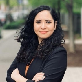 Woman wearing black blazer, smiling and standing in front of a street.